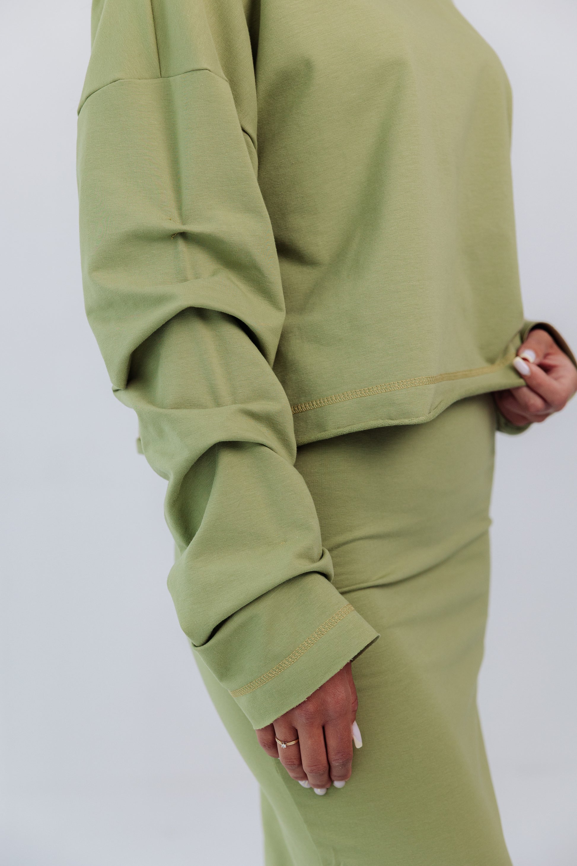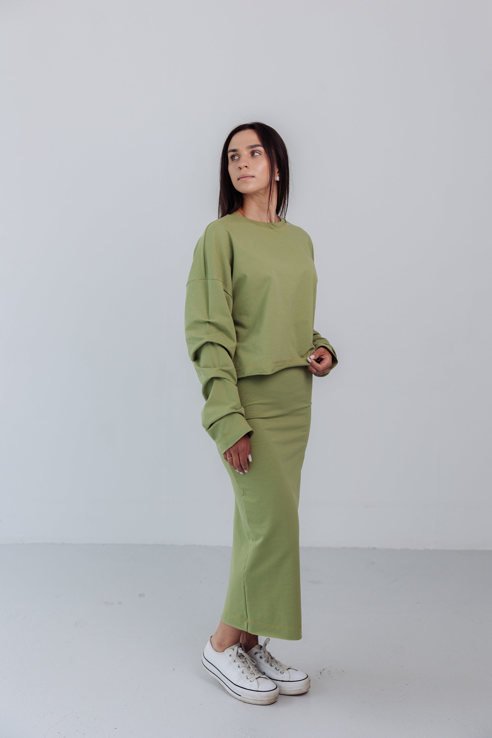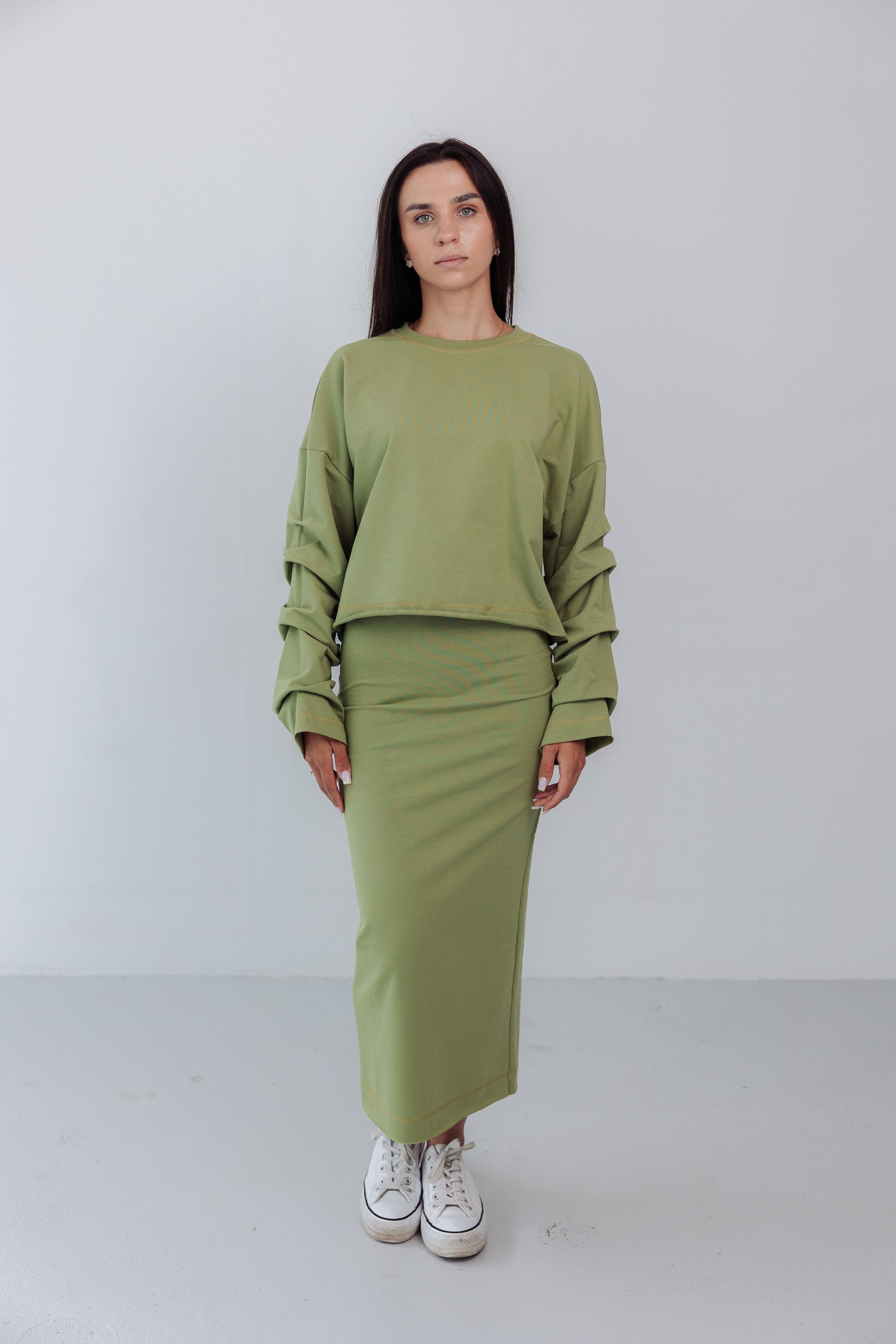 Komplet dresowy Mariette pistacja- swobodna elegancja z nutą świeżości. Dwuczęściowy zestaw to idealne połączenie wygody i stylu. Bluza o luźnym kroju, z subtelnymi marszczeniami na rękawach, dodaje lekkości i kobiecego wyrazu. Dopasowana spódnica typu tuba z rozcięciem z tyłu podkreśla sylwetkę, zapewniając jednocześnie komfort i swobodę ruchu. Całość tworzy spójny, nowoczesny look- idealny na co dzień, do pracy czy na spotkanie.